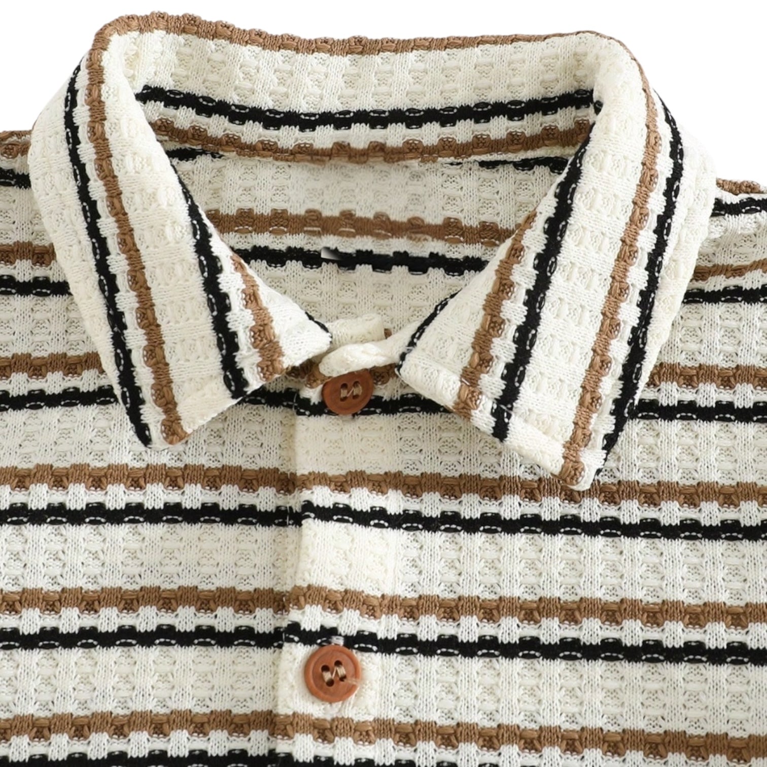 👔 Camisa: Tejido ligero con textura tipo waffle y rayas en tonos beige, negro y blanco.