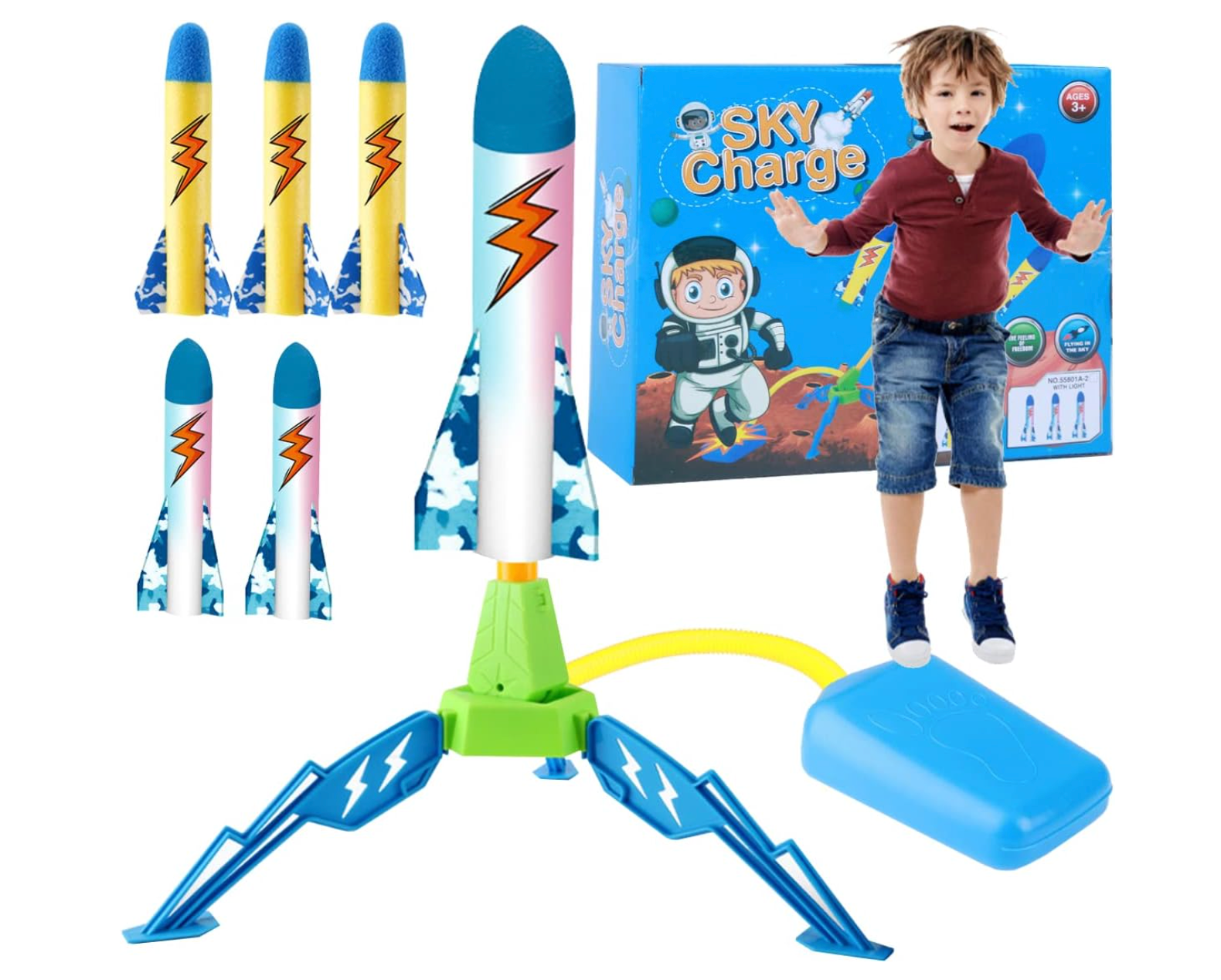 - Lanzador de cohetes de juguete: ¡Corre / salta / lanza! Aleja a los niños del tiempo frente a la pantalla y fomenta el juego activo, en interiores o al aire libre. ¡Diseño duradero para soportar horas interminables de saltos, pisotones y tiempo de juego! Seguro para mayores de 3 años.